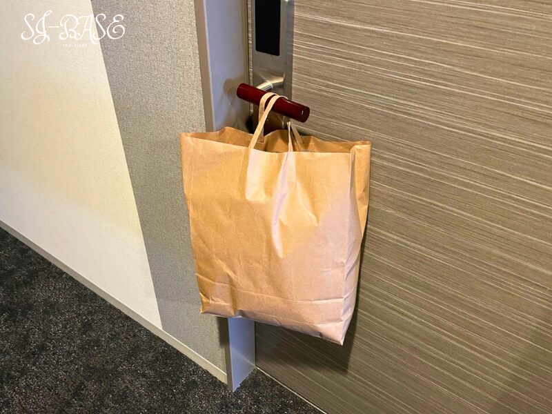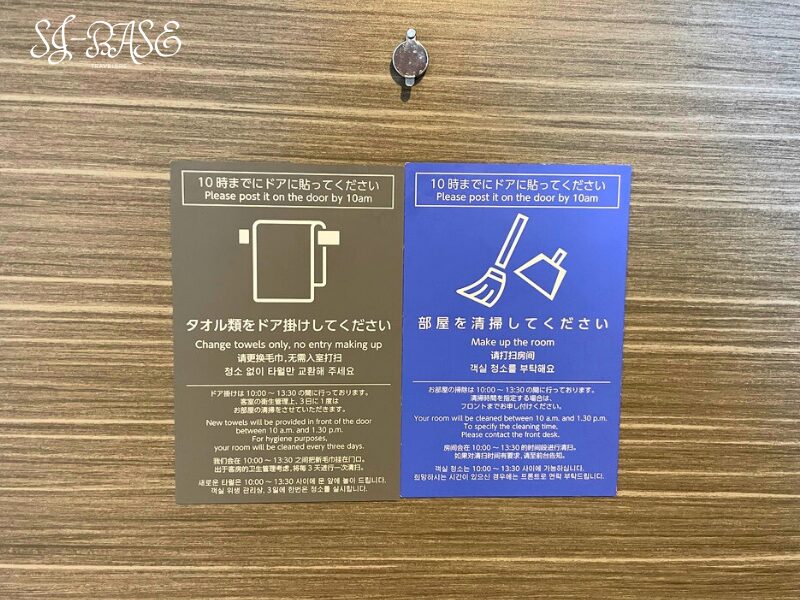 連泊で清掃を希望しない日は、案内札をドアの外に貼り付けておくことで、タオル類・替えのゴミ袋・ミネラルウォーターを部屋のドアノブに掛けておいてもらえました。