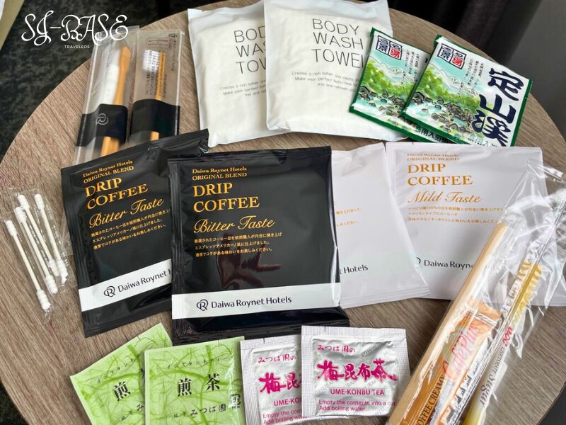 入浴剤や歯ブラシ、カミソリ、ヘアブラシ、綿棒、ボディタオルのほか、コーヒー・紅茶・お茶などのドリンク類も用意されていました。