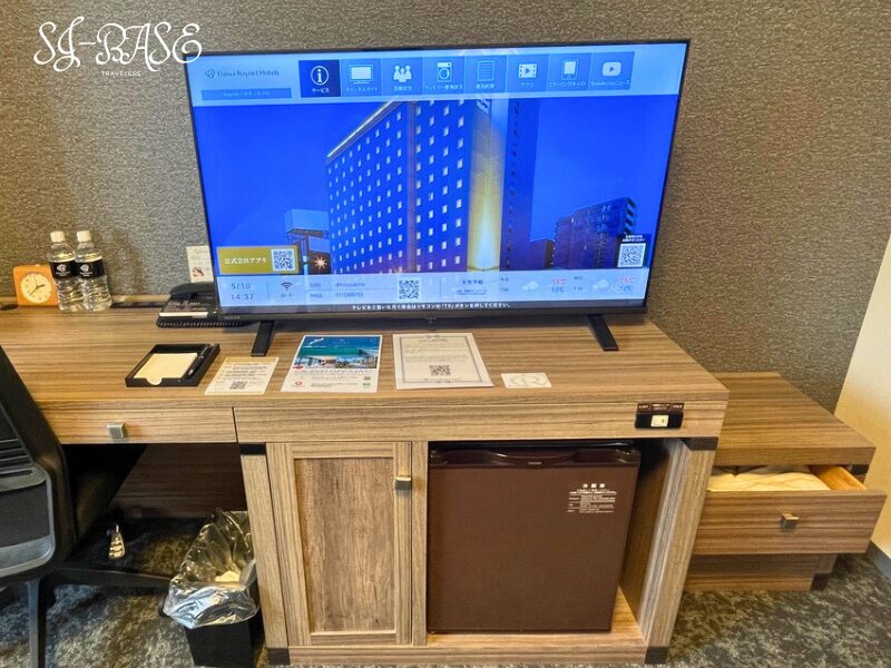 テレビ下には空の冷蔵庫が設置されており、買ってきた飲み物や食べ物を冷やしておけるのも地味に便利なポイント。
