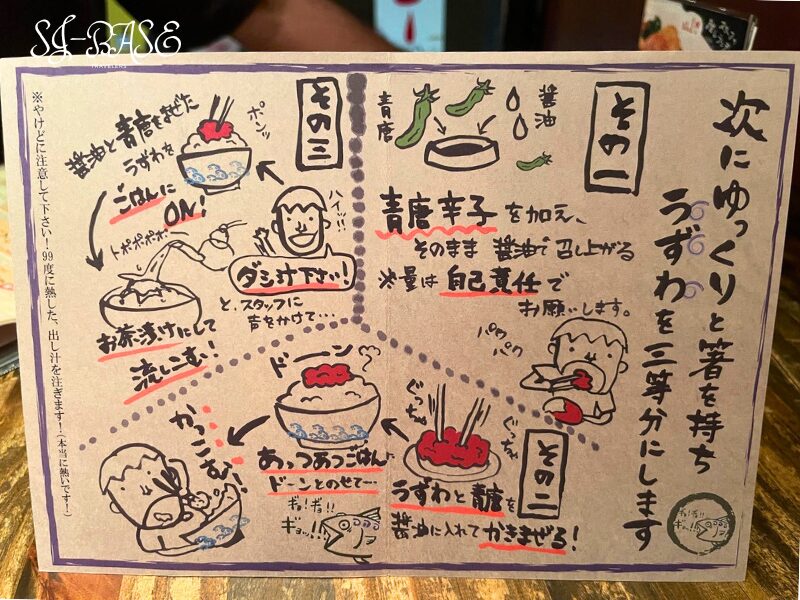 早速うずわを注文すると、「うずわ定食の正しい食べ方」が描かれた味のある可愛いリーフレットが渡されます。