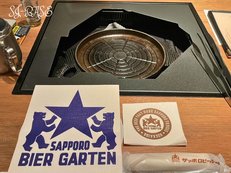 席に着くと北海道を模ったジンギスカン鍋とロゴ入りの紙エプロンやコースターがセットされていました。