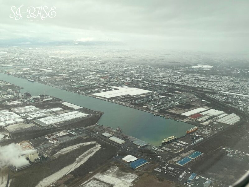 飛行機の窓から見えたのは、うっすらと雪化粧した街並み。